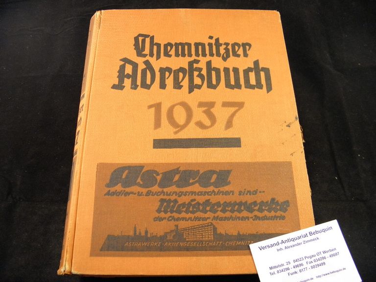 CHEMNITZ.– CHEMNITZER ADRESSBUCH 1937.– Mit Siegmar-Schönau, Adelsberg, Glösa, Harthau und Rabenstein. 79. Aufl. Chemnitz (Pickenhahn), 1937. Gr. 4°. 14 Bl., 48, 632, 288, 96 S. ill. OLn. unteres Kap. leicht angeplatzt, Einband etwas beschmutzt, sonst von guter Erhaltung. seltene Ausgabe.