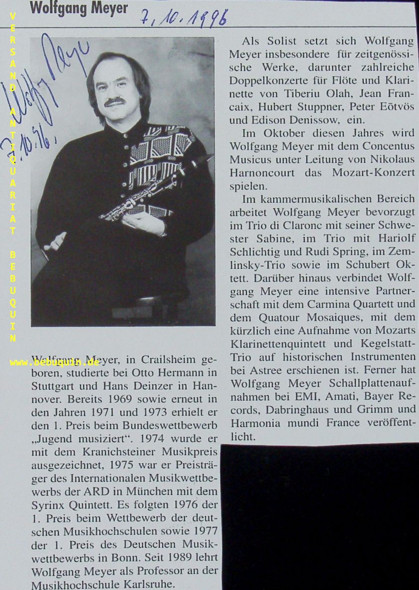 MEYER, Wolfgang (Klarinettist): eigenhändig signierte und datierte Portraitseite. München (Philharmonie), 7.10.1996. 18 x 13 cm. 1 Bl. Wolfgang Meyer (* 13. August 1954 in Crailsheim; † 17. März 2019 in Karlsruhe) war ein deutscher Klarinettist. (Wikipedia)