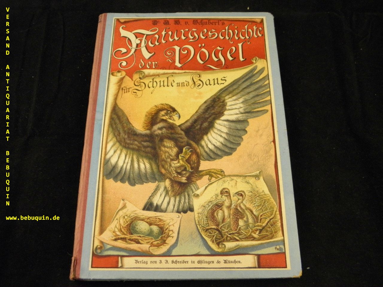 ORNITHOLOGIE.– SCHUBERT, Gotthilf Heinrich von: Naturgeschichte der Vögel. Anschauungs-Unterricht für die Jugend in Schulen und Familien. Hrsg. von namhaften Fachgelehrten und Tierzeichnern. 9. Aufl. Eßlingen (Schreiber), 1887. Gr. 4°. (3) Bll., 22 S. Text mit 195 kolorierten Abbildungen auf 30 Tafeln und mit 46 Text-Illustrationen, worunter 32 kolorierte Abbildungen von Vogeleiern. farb. ill. OPb. unterer Rücken leicht angeplatzt, sonst sehr feines Ex. = Naturgeschichte des Tier-, Pflanzen- und Mineralreichs, II. Teil.