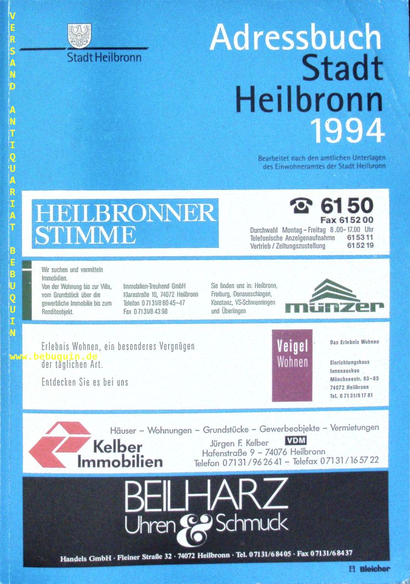 HEILBRONN.– ADRESSBUCH DER STADT HEILBRONN 1994.– Heilbronn (Adressbuch), 1994. 4°. 40, 336, 32, 184, 48 S. ill. OKart. gut erhalten. Enthält Namen- und Firmenteil, Straßen- und Häuserteil, Branchen- und Behördenteil.