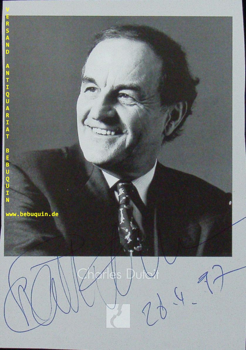 DUTOIT, Charles (Dirigent): eigenhändig signierte und datierte Portraitseite. München (Philharmonie), 28.4.1997. 18 x 12,5 cm. 1 Bl. Charles Édouard Dutoit (* 7. Oktober 1936 in Lausanne) ist ein Schweizer Dirigent mit Wohnsitz in Kanada. (Wikipedia)