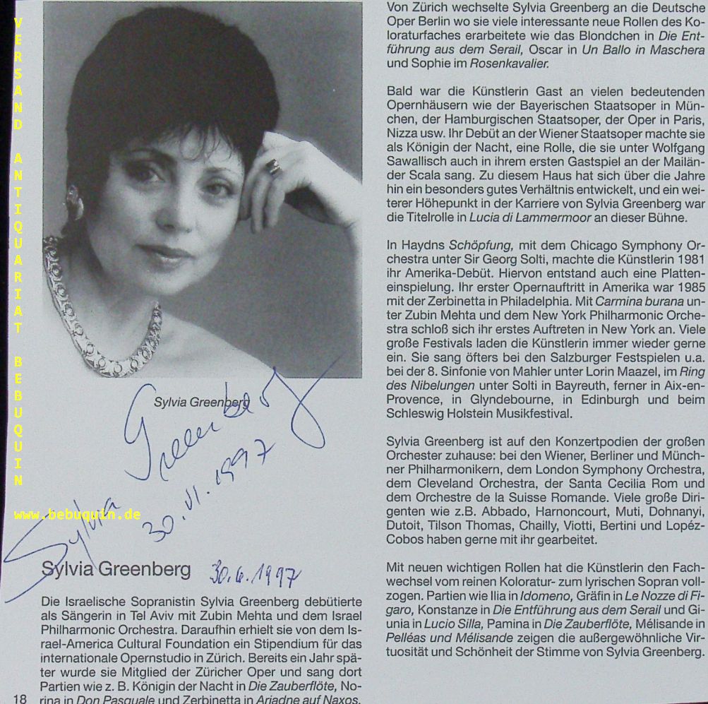 GREENBERG, Sylvia (Sopran): eigenhändig signierte und datierte Portraitseite. München (Philharmonie), 30.6.1997. 18 x 12,5 cm. 1 Bl. Sylvia Greenberg (* 1955 in Bukarest) ist eine rumänisch-israelische Opernsängerin (Koloratursopran) und Professorin für Gesang an der Hochschule für Musik und Theater München. (Wikipedia)