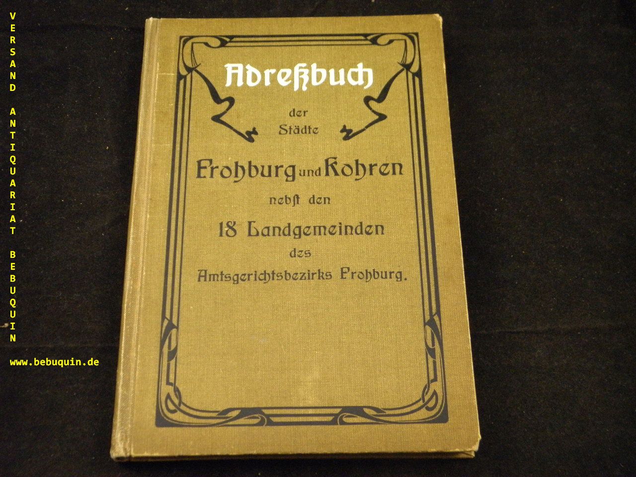 FROHBURG.– ADRESSBUCH DER STÄDTE FROHBURG UND KOHREN 1911. Nebst 18 Landgemeinden des Amtsgerichtsbezirks Frohburg. Texte von Sperling und Steglich. Frohburg (Geißler), 1911. 4b Bl., 100 S. mit zahlr. Abb., Geschäftsanzeigen und Verkehrskarte. ill. OHLn. tadellos. sehr seltenes Adressbuch.
