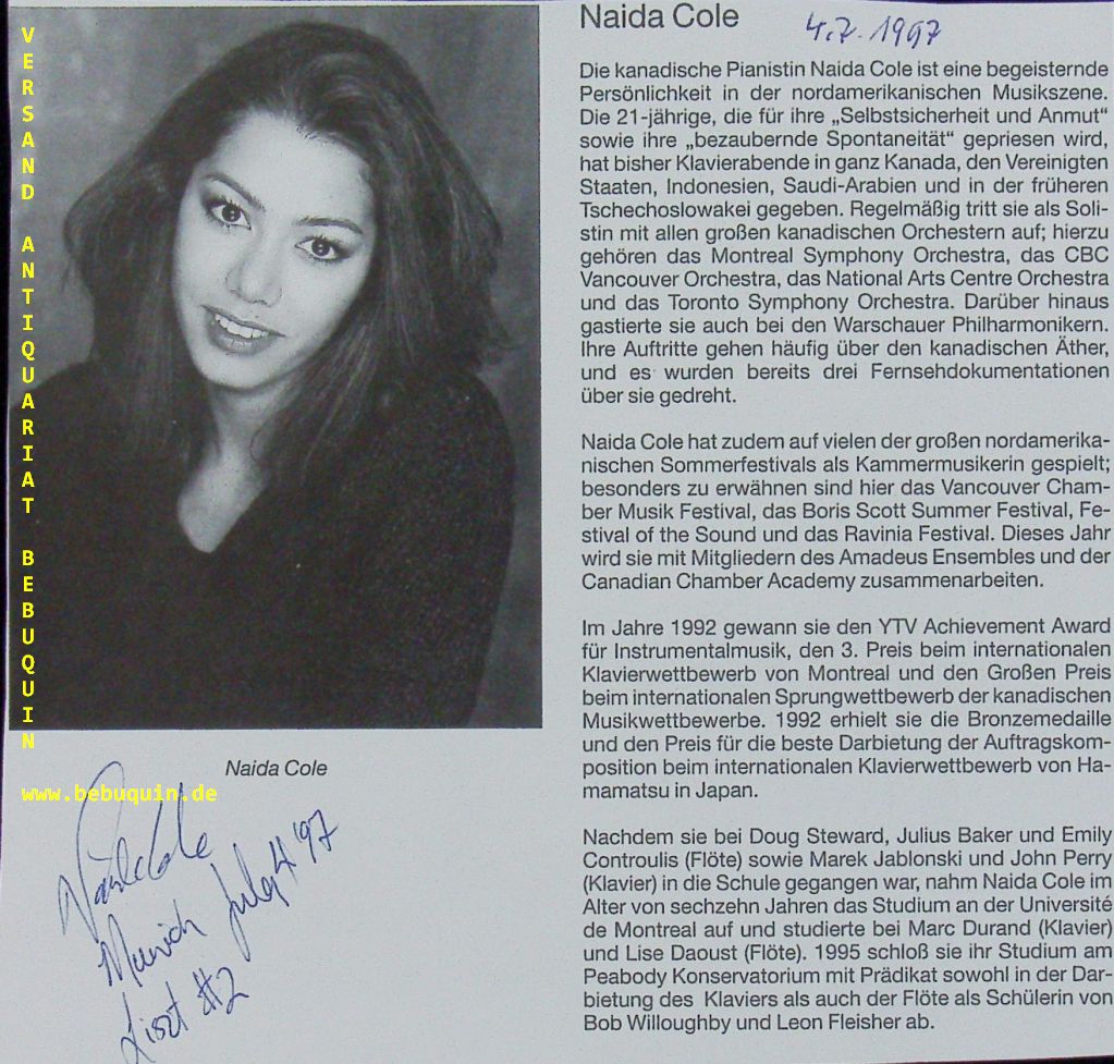 COLE, Naida (Pianistin, Flötistin): eigenhändig signierte und datierte Portraitseite. München, 4.7.1997. 16 x 16,5 cm. 1 Bl. seltenes Autogramm. Naida Cole (* 28. Oktober 1974 in Durham, North Carolina) ist eine kanadisch-amerikanische Pianistin und Flötistin. (Wikipedia)