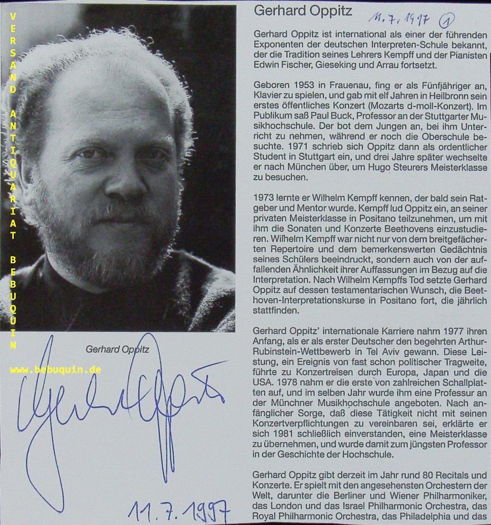 OPPITZ, Gerhard (Pianist): eigenhändig signiertes und datiertes Portraitbild. München (Philharmonie), 11.7.1997. 17,5 x 17 cm. 1 Bl. Gerhard Oppitz (* 5. Februar 1953 in Frauenau/Bayern) ist ein deutscher Pianist. Er setzt sich auch für zeitgenössische Komponisten wie Lutoslawski, Ligeti, Messiaen, Henze, Veerhoff, Sauter und Boulez ein. (Wikipedia)