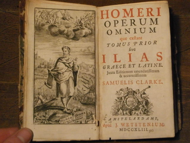 HOMER: Operum omnium quae exstant tomus prior sive Ilias graece et latine. Juxta editionem emendatissimam & accuratissimam Samuelis Clarke. Amsterdam (Westenius), 1743. 12°. 3 Bl., 619, 9 S. mit 2 (davon 1 gefalteten) Kupfertafeln sowie Titel- und Schlußvignette. Titel in Zweifarbendruck rot und schwarz. HLdr der Zeit. Rücken und Kanten stärker abgerieben, Titelei mit den Kupfern lose, im Block jedoch fest und schön. wohl die 1. Aufl. dieser Ausgabe. Homers Illias in der griechischen und lainischen Ausgabe.