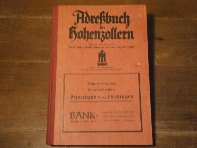 HOHENZOLLERN.– ADRESSBUCH FÜR HOHENZOLLERN 1935.– Umfasst die Gemeinden von Sigmaringen und Hechingen. Sigmaringen (Liehner), 1935. Gr. 8°. 368 S. und Werbeseiten. ill. OHLn. NaV, gute Erhaltung. Sehr seltenes Adressbuch.