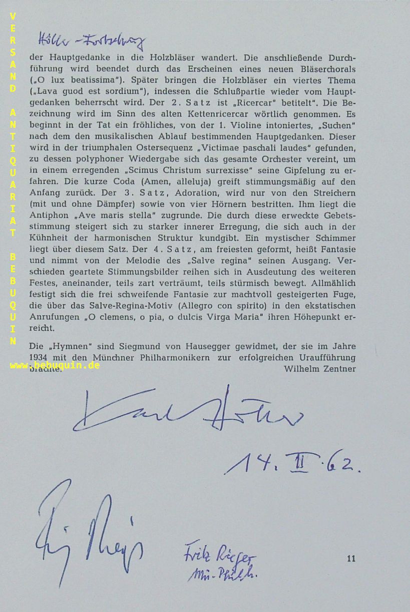 HÖLLER, Karl (Komponist) + RIEGER, Fritz (Dirigent): eigenhändig von beiden signierter und datierter Artikel über Karl Höller München, 14.2.1962. 20 x 13 cm. 2 Bl. . Karl Höller (* 25. Juli 1907 in Bamberg; † 14. April 1987 in Hausham) war ein deutscher Komponist, Dirigent, Organist und Hochschullehrer. Friedrich Edmund Rieger (* 28. Juni 1910 in Oberaltstadt, Österreich-Ungarn; † 30. September 1978 in Bonn) war ein deutscher Dirigent und Generalmusikdirektor. (Wikipedia)