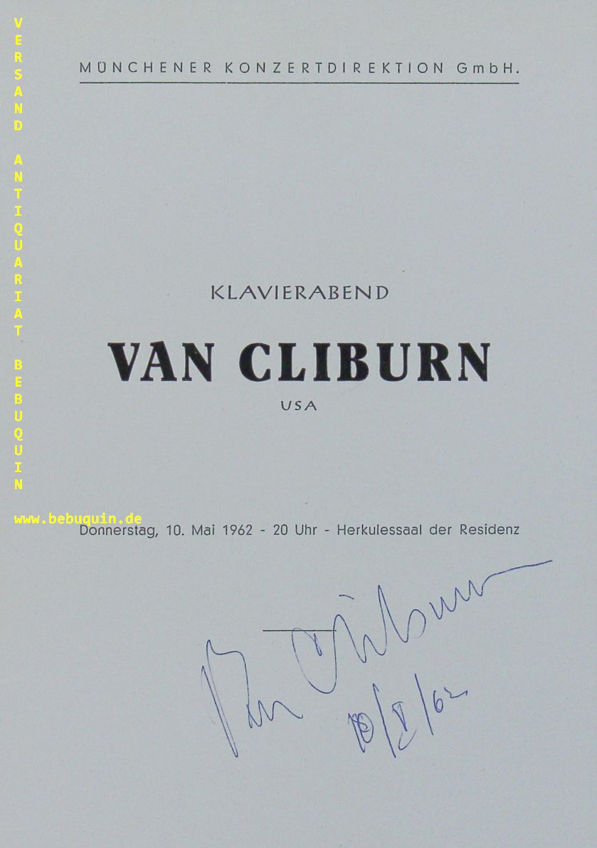 CLIBURN, Van (Pianist): eigenhändig signierte und datierte Programmseite. München (Herkulessaal), 10.5.1962. 21 x 15 cm. 1 Bl. Van Cliburn (* 12. Juli 1934 als Harvey Lavan Cliburn jr. in Shreveport, Louisiana; † 27. Februar 2013 in Fort Worth, Texas) war ein US-amerikanischer Pianist. „Es gibt nur zwei unersetzbare Dinge“, hatte Cliburn kurz vor seinem Tod in einem seiner letzten Interviews gesagt: „Großartige Musik und wunderschöne Erinnerungen“. (Wikepedia)