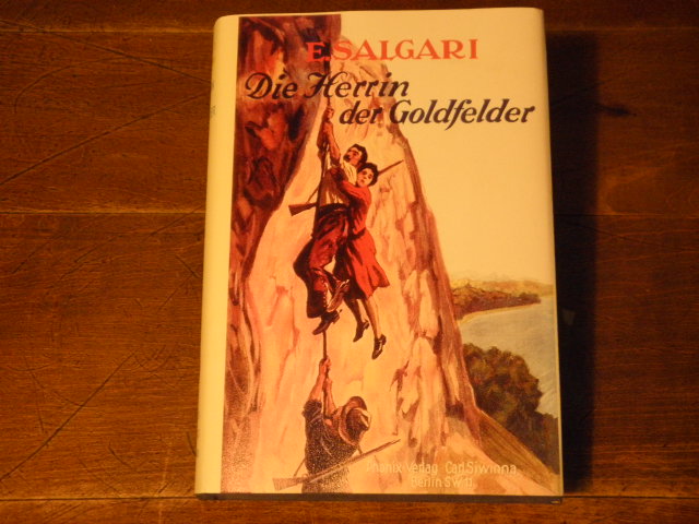 SALGARI, Emilio: Die Herrin der Goldfelder. Abenteuerroman. D.v. Heinz Hellwig. Berlin (Phönix), 1930. 319 (1) S. mit 1 Titelbild. OLn mit goldgeprägter Deckelbeschriftung und -vignette mit Umschlag in Farbkopie. Einbandbeschriftung teils geblichen. dt. EA.