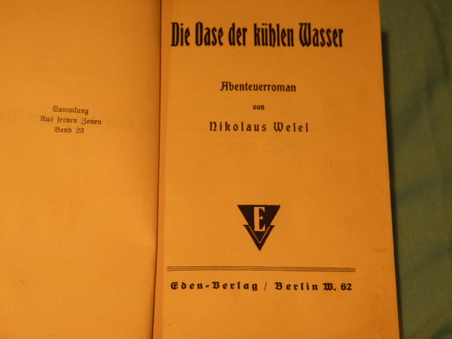 WESEL, Nikolaus: Die Oase der kühlen Wasser. Abenteuerroman. Berlin (Eden), 1935. 256 S. Ln der Zeit. Vortitel mit kleinem Fleck. = Aus fernen Zonen, Bd. 23. EA.