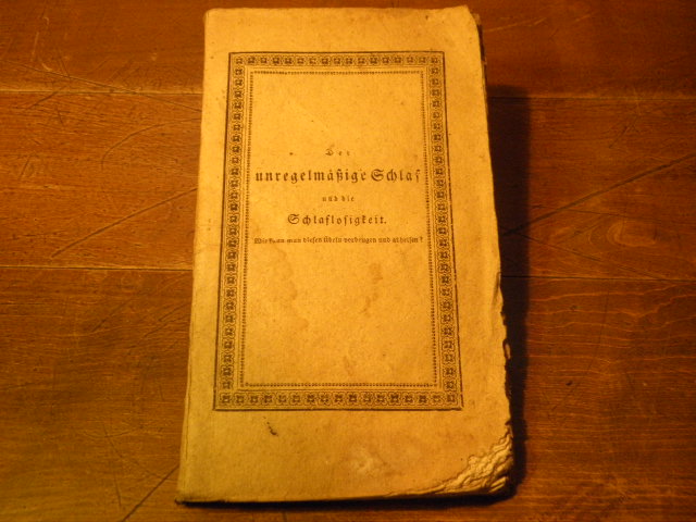 MEDIZIN.– RICHTER, Friedrich: Der unregelmäßige Schlaf und die Schlaflosigkeit. Wie kann man diesen Übeln vorbeugen und abhelfen? Nebst Betrachtungen über den Schlaf überhaupt. Eine Schrift für alle Diejenigen, welche an Schlaflosigkeit leiden. Wien (Franz Ludwig), 1825. 104 (3) S. ill. OBr. eine Ecke benagt, Papier altersbedingt gebräunt und bis zur fünfzigsten Seite abnehmend wasserrandig. seltene EA.