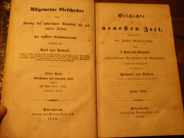 ROTTECK, Hermann von: Geschichte der neuesten Zeit enthaltend die Jahre 1815-1840. 2. Theil. Nach Karl von Rotteck’s hinterlassenden Vorarbeiten und Materialien. Geschichte der neuesten Zeit. Pforzheim (Finck), 1843. 694 S. + 33 Stichen. HLdr der Zeit mit goldgeprägtem Rücken. Kanten berieben, innen nur vereinzelt stockfleckig. EA. Karl von Rotteck (1775-1840) war Historiker und liberaler Politiker. Er gilt als Impulsgeber für den „Badischen Liberalismus“ und arbeitete mit an der Badischen Verfassung von 1818. Bis auf einen kürzeren Abschitt über Amerika ist dies eine Geschichte Europas.