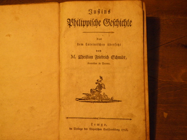ANTIKE.– JUSTINUS: Marcus Iunianus: Justins Philippische Geschichte. D.v. M. Christian Friedrich Schmidt. Lemgo (Meyersche), 1786. 3 Bl., 386 (2) S. mit 4 gestochenen teils figürlichen Vignetten. Pb der Zeit. Rücken abgerieben, wenige kleine Portraitskizzen im Weiß. 1. Aufl. dieser Übersetzung des römischen Geschichtsschreibers. Marcus Iunianus Iustinus, auch als Justinus oder Justin bezeichnet, war ein römischer Geschichtsschreiber. Wann er lebte, ist nicht genau bekannt. (Wikipedia)
