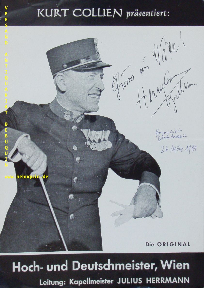 HERRMANN, Julius (Dirigent): eigenhändig signiertes Posrtraitheft: Gruss aus Wien! Herrmann Kapellmeister. Kurt Coillien präsentiert: Hamburg 26.3.1961. 30 x 21 cm. großes Faltblat mittig gefaltet. sehr dekorativ. Julius Herrmann (* 13. Dezember 1889 in Wiener Neustadt; † 14. Februar 1977 in Wien) war ein österreichischer Militärkapellmeister. (Wikipedia)