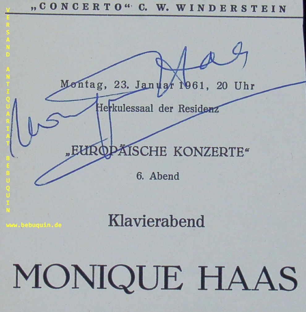 HAAS, Monique (Pianistin): eigenhändig signiertes Blatt. München (Herkulessaal), 23.1.1961. 17,5 x 24 cm. 1 Bl. leicht beschnitten. Monique Haas (* 20. Oktober 1909 in Paris; † 9. Juni 1987 ebenda) war eine französische Pianistin. (Wikipedia)