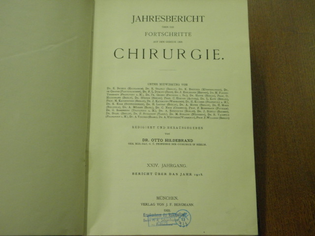 MEDIZIN.– HILDEBRAND, Otto: (Hrsg.) Jahresbericht über die Fortschritte auf dem Gebiete Chirurgie. Jg. XXIV. München (Bergmann), 1922. Gr. 8°. XIII, 713 S. OHLdr mit goldgeprägtem Rücken. Ordnungsgemäß aus den Beständen der Volkspolizei ausgesondertes Bibliotheksexemplar (Rückenschild, Stempel), gutes Ex. Mit Beiträgen von: K.Bartholdy, A.Becker, E.Becker, E.Bennecke, C.Bötticher, A.Borchard, B.Bosse, A.Brentano, K.Brunner, L.Burckhardt, W.Clausen, J.Dollinger, R.Dumstrey, E.Ehrich, J.Fertig, F.Fischer, P.L.Friedrich, R.Galeazzi, R.Giani, P.Glaessner, E.Goldmann, E.Hagenbach, O.Hildebrand, R.v.Hippel, A.Hoffa, F.Hofmeister, G.Hosemann, C.Hueter, J.Ipsen, A.Jäck, E.Kammeyer, Karcher, Kaschke, M.Katzenstein, E.Kirchhoff, W.Klestadt, Th.Kölliker, O.Lanz, D.Mac Gillavry, H.Meerwein, Fr.Mertens, W.L.Meyer, E.von Meyer, H.Mohr, E.Moser, A.Müller, C.Neck, M.Neuhaus, O.Nordmann, E.Pagenstecher, C.Partsch, F. Pels Leusden, A.Pertz, K.Pochhammer, W.Prutz, H.Reerink, W.Reich, L.Reichenbach, W.Rindfleisch, A.Ritschl, C.Ritter, Rosenbach, E.Ruge, O.Samter, F.Sauerbruch, A.Schönstadt, F.Schultze, J.Schulz, K.Seydel, M.Strauss, G.Sultan, F.Suter, J.Thon, E.Veillon, R.Volkmann, E.Voswinckel, R.Waldvogel, Wanach, H.Wendriner, W.Willemer, F.Williger, Wilmanns, P.Ziegler und G.Zimmermann.
