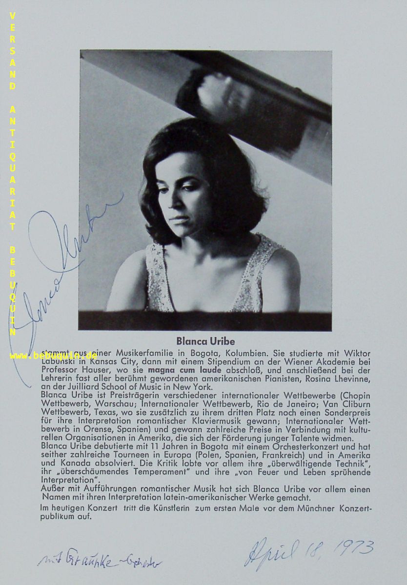 URIBE, Blanca (Pianistin): eigenhändig signierte und datierte Portraitseite. München (Herkulessaal), 18.4.1973. 21 x 15 cm. 1 Bl. Blanca Uribe (1940—) – Pianist. Born in Bogota, Colombia into a family of many generations of professional musicians. She studied in Vienna at the Academy of Music and Dramatic Art with Richard Hauser and in New York at The Juilliard School with Rosina Lhevinne and Martin Canin. Her extensive repertoire ranges from Scarlatti to works of the present. Particularly notable are her interpretations of the 32 Sonatas of Beethoven, which she performed in cycle on several occasions, and the complete Iberia of Isaac Albéniz.