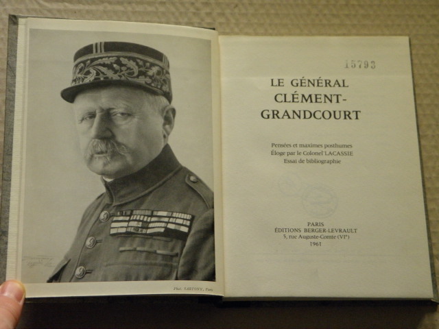 LACASSIE: Le General Clement-Grandcourt. Pensées et maximes posthumes eloge. Esai de bibliographie. Paris (Berger-Levrault), 1961. 165 S. mit 1 Titelportrait. HLn der Zeit. Ordnungsgemäß aus Bundeswehrbeständen ausgesondertes Bibliotheksexemplar (Stempel, Rückenschild). EA.