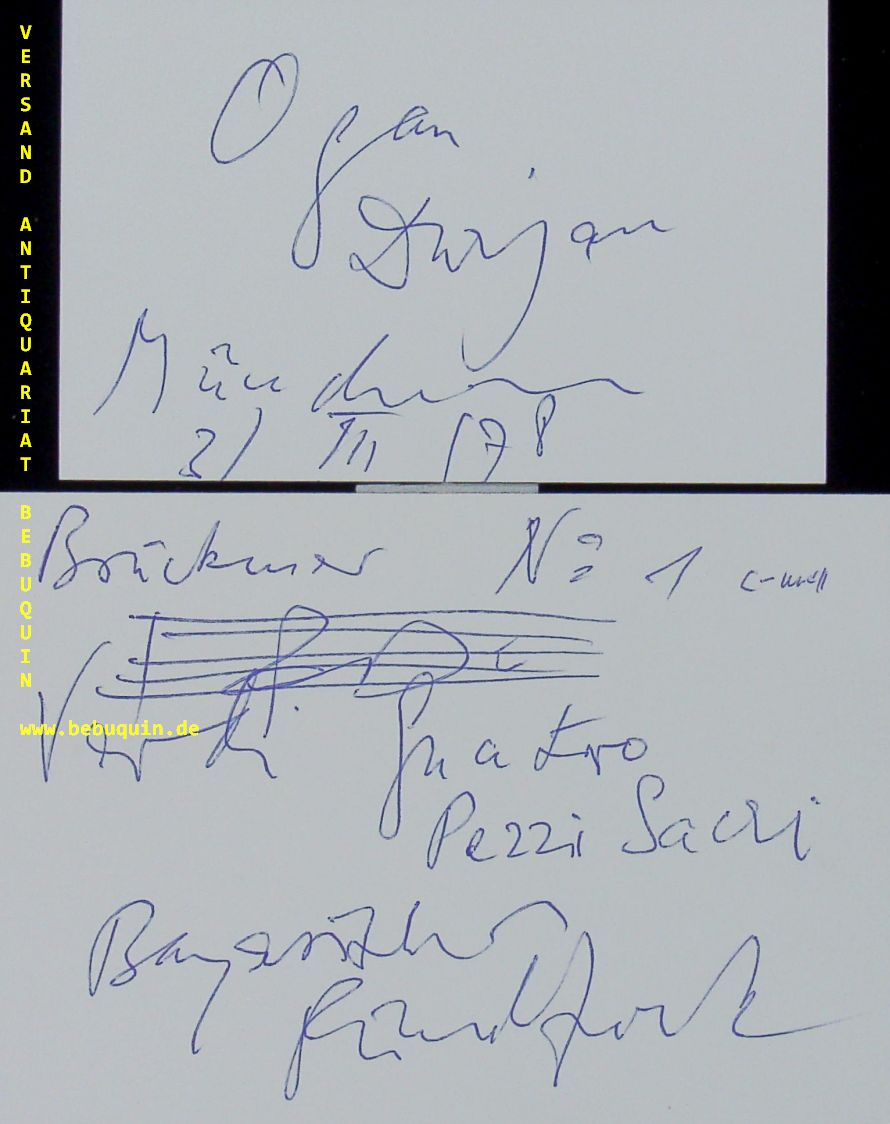 DURJAN, Ohan (Komponist, Dirigent): (hier als Organ D-Narc) 2 eigenhändig mit Notenlinien signierte und bezeichnete Autogrammkarten. München (Herkulessaal), 2.3.1978. 10,5 x 14,5 cm. 2 Karteikarten. Ohan Durjan (* 8. September 1922 in Jerusalem, Völkerbundsmandat für Palästina, heute Israel; † 6. Januar 2011 in Jerewan, Armenien) war ein armenischer Dirigent und Komponist. (Wikipedia)