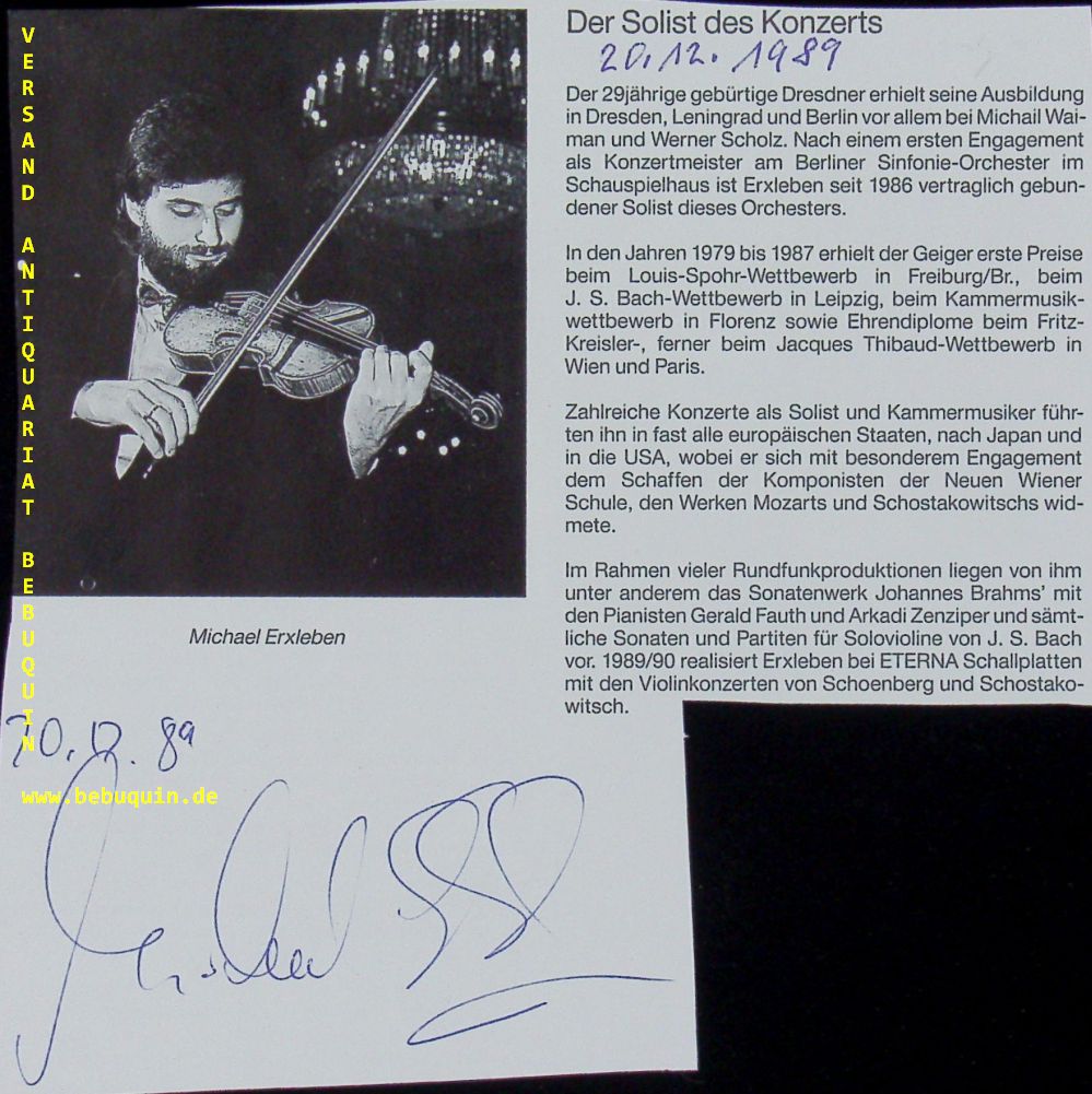 ERXLEBEN, Michael (Violinist): eigenhändig signierte und datierte Portraitseite. München (Herkulessaal), 20.12.1989. 16,5 x 17 cm. 1 Bl.