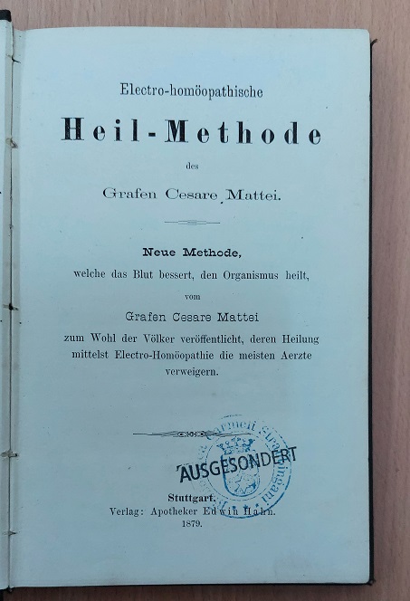 HOMÖOPATHIE.– MATTEI, Cesare: Electro-homöopathische Heil-Methode des Grafen Cesare Mattei. Neue Methode, welche das Blut bessert, den Organismus heilt, vom Grafen Cesare Mattei zum Wohl der Völker veröffentlicht, deren Heilung mittels Electro-Homöopathie die meisten Ärzte verweigern. Stuttgart (Hahn), 1879. 200 S. + 1 doppelblattgroße Bildtafel. Ln der Zeit mit Blindprägung und goldgeprägtem Rücken. Ordnungsgemäß ausgesondertes Bibliotheksexemplar (Rückenschild und Stempel). Diese deutsche Erstausgabe von großer Seltenheit. Cesare Mattei war ein italienischer Adliger, Literat, Politiker, Homöopath und bekannter Wunderheiler des 19. Jahrhunderts. Mattei ist der Begründer der Elektrohomöopathie. Er wuchs in einer wohlhabenden Familie in Ferrara auf und wurde zunächst Politiker. Später gab er seine Ämter auf um sich privat der Homöopathie zu widmen. Er gründete dazu ein selbst finanziertes Behandlungszentrum innerhalb seines neu erbauten Schlosses namens Rocchetta Mattei in Grizzana Morandi. Auf Schloss Rocchetta Mattei soll Mattei auch Prominente wie König Ludwig von Bayern und Zar Alexander II. mit seiner Elektrohomöopathie behandelt haben.