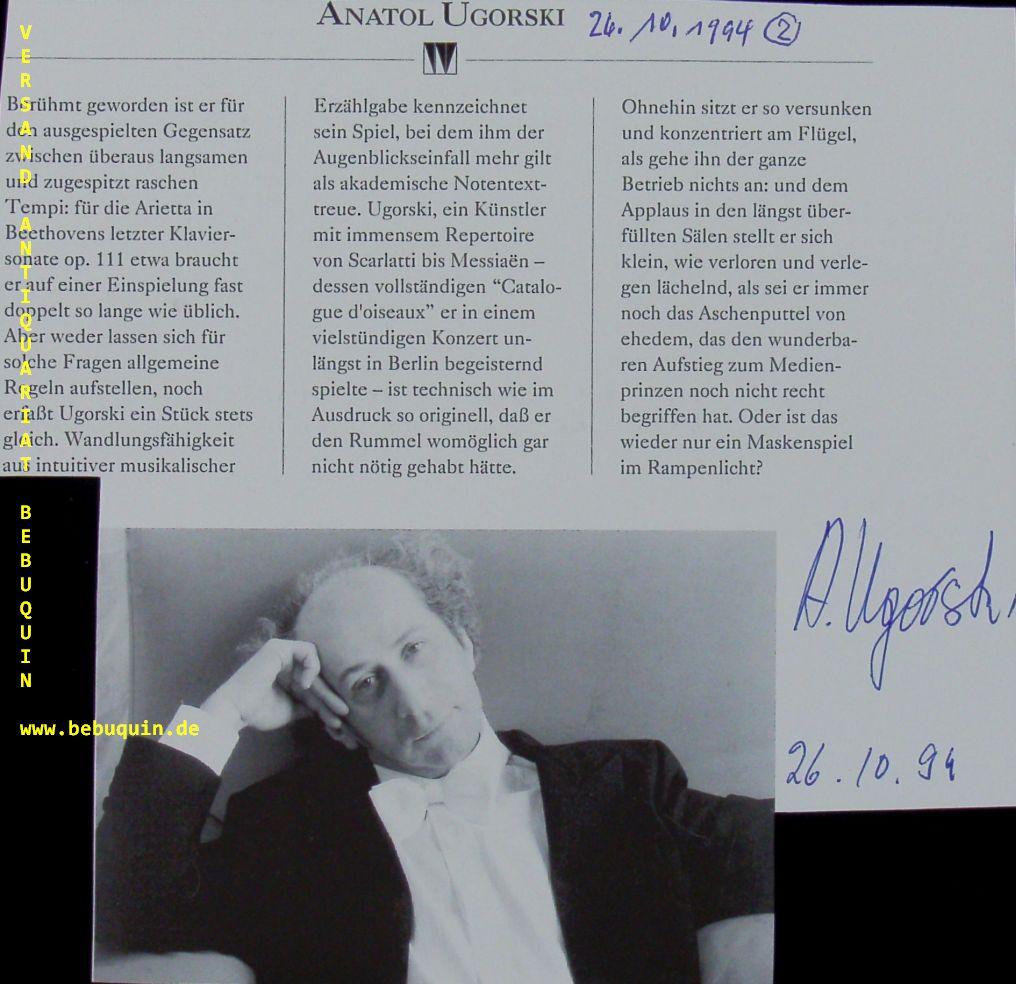 UGORSKI, Anatol (Pianist): eigenhändig signierte und datierte Portraitseite. München (Philharmonie), 26.10.1994. 17 x 17 cm. 1 Bl. Anatol Ugorski (* 28. September 1942 in Rubzowsk, Sibirien) ist ein russischer Pianist, der seit 1990 in Deutschland lebt und international gastiert. Anatol Ugorski kam als viertes von fünf Geschwistern zur Welt. 1945 zogen die Eltern nach Leningrad. Dort wurde er mit sechs Jahren in die an das Konservatorium angegliederte Spezialmusikschule aufgenommen, obwohl er nur singen und Xylophon spielen konnte. (…) Bei einem Leningrader Gastspiel von Pierre Boulez, das in einer Zeit relativer kultureller Offenheit vor dem Prager Frühling arrangiert worden war und dann im Herbst 1968 (kurz nach dem Einmarsch von Truppen des Warschauer Pakts) stattfand, wurde sein begeisterter Applaus als politische Demonstration gedeutet. Er musste sich vor einem Komitee verantworten. Da man ihn aufgrund seiner Liebe zur zeitgenössischen Musik für politisch unzuverlässig hielt, wurde er an der Fortsetzung seiner Karriere gehindert und konnte mehr als zehn Jahre lang nur vor Schulklassen in der sowjetischen Provinz auftreten.