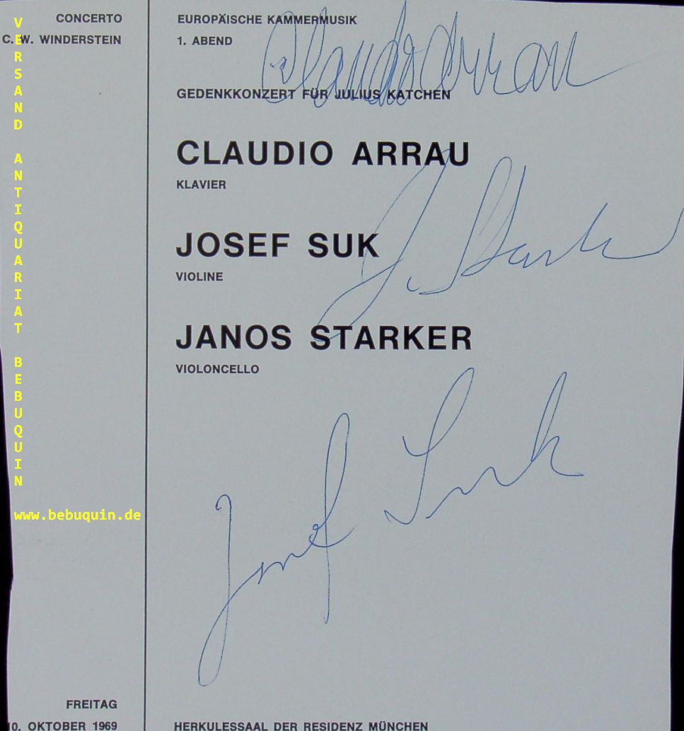 SUK, Josef (Violinist) + STARKER, Janos (Cellist) + ARRAU, Claudio (Pianist): eigenhändig von allen signierte Programmseite. München (Kongresssaal), 10.10.1969 18 x 16 cm. 1 Bl. Claudio Arrau León (* 6. Februar 1903 in Chillán, Chile; † 9. Juni 1991 in Mürzzuschlag, Österreich) war ein chilenischer Pianist. János Starker (* 5. Juli 1924 in Budapest; † 28. April 2013 in Bloomington (Indiana), USA) war ein US-amerikanischer Cellist und Musikpädagoge ungarischer Herkunft. Er gilt neben Pau Casals, Emanuel Feuermann, Paul Tortelier und Mstislaw Rostropowitsch als einer der bedeutendsten Cellovirtuosen des 20. Jahrhunderts. Josef Suk (* 8. August 1929 in Prag; † 7. Juli 2011 ebenda) war ein tschechischer Geiger und gelegentlicher Bratscher. Er war der Enkel des Komponisten Josef Suk und Urenkel des Komponisten Antonín Dvorák. (Wikipedia)