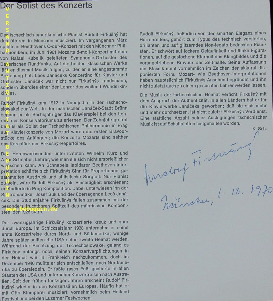FIRKUSNY, Rudolf (Pianist): eigenhändig signierte und datierte Programmseite. München (Herkulessaal), 1.10.1970. 21,5 x 19,5 cm. 1 Bl. Rudolf Firkušný (* 11. Februar 1912 in Napajedla, Mähren; † 19. Juli 1994 in Staatsburg, New York) war ein tschechischer Pianist. (Wikipedia)
