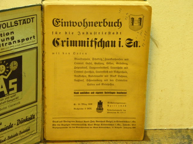 EINWOHNERBUCH FÜR DIE INDUSTRIESTADT CRIMMITSCHAU 1938.-