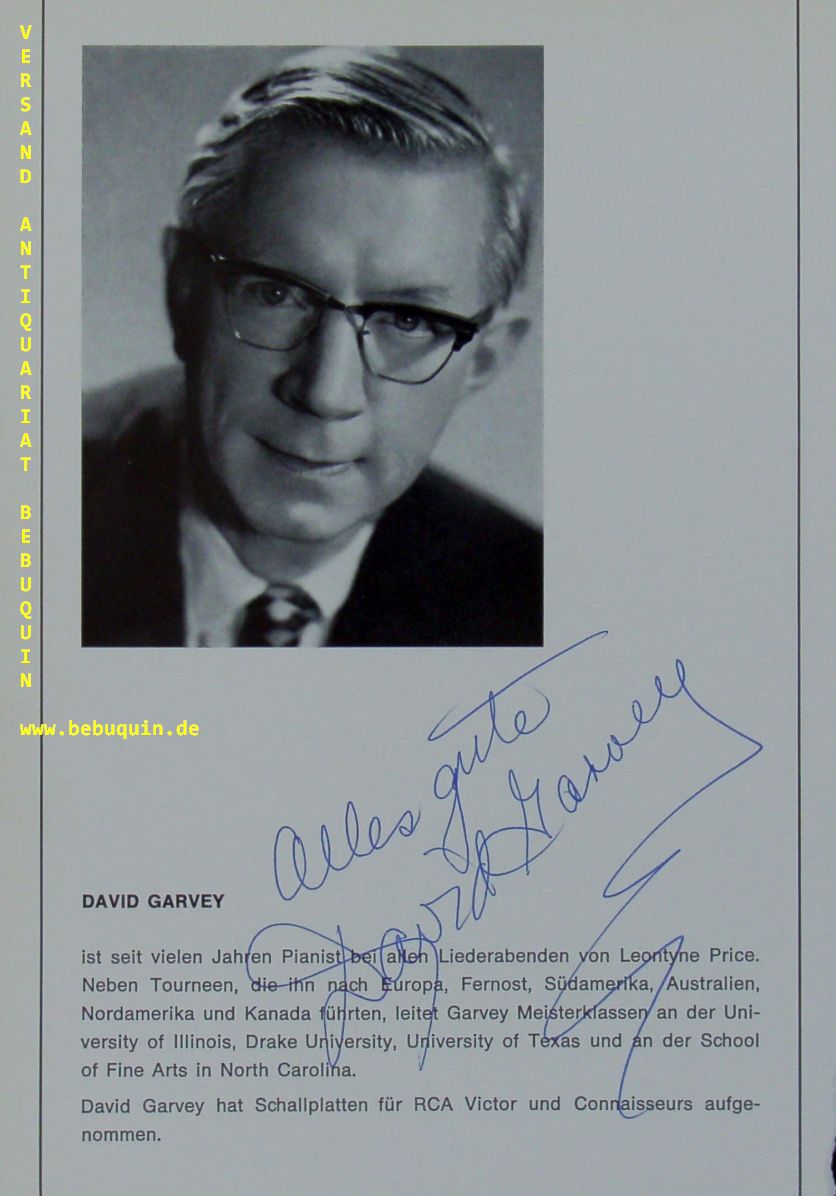 GARVEY, David (Pianist): eigenhändig signierte Portraitseite: Alles Gute. München (Philharmonie), 26.11.1975. 21 x 14,5 cm. 1 Bl. David William Garvey (March 13, 1922 – February 14, 1995)[2] was an American pianist and academic. He is known as the regular accompanist of Leontyne Price and other performers, including violinists Itzhak Perlman, Michael Rabin and Wanda Wilkomirska. (Wikipedia)