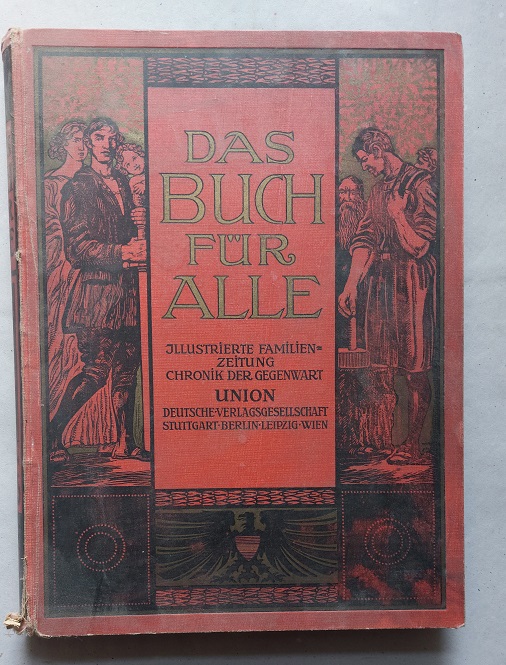 DAS BUCH FÜR ALLE. Illustrierte Familien-Zeitung. Chronik der Gegenwart. 51. Jg. Stuttgart (Union), 1916. Fol. 672 S. mit zahlr. Abb. ill. OLn. Einband leicht bestaubt, Titelseite etwas knitterspurig, Schnitt mit kleinem Fleck, insgesamt noch gut erhalten. Inhalt: Romane, Novellen und Erzählungen; Gedichte; Länder- und Völkerkunde; Kunst- und Kulturgeschichte; Aus der Natur; Geschichte und Tagesereignisse, Bilder vom Weltkrieg; Heerführer im Weltkriege und andere Persönlichkeiten; Gemälde; Industrie, Technik, Handel, Verkehr, Volkswirtschaft, Haus- und Landwirtschaft, usw.; Militärisches, Seewesen, Sport, usw.; Physiologie, Heilkunde, Gesundheitspflege, usw. von A. Noel, Ida Bock, Ernst Georgy, Friedrich Jacobsen u.a.