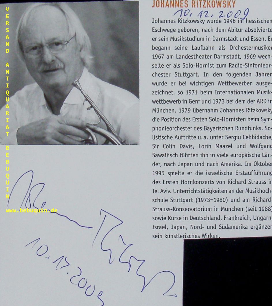 RITZKOWSKY, Johannes (Hornist): eigenhändig signierter und datierter Programmausschitt. München, 10.12.2009. 15 x 13 cm. 1 Bl. Johannes Ritzkowsky (* 24. Juni 1946 in Eschwege) ist ein deutscher Hornist und Dozent an einer Musikhochschule. (Wikipedia)
