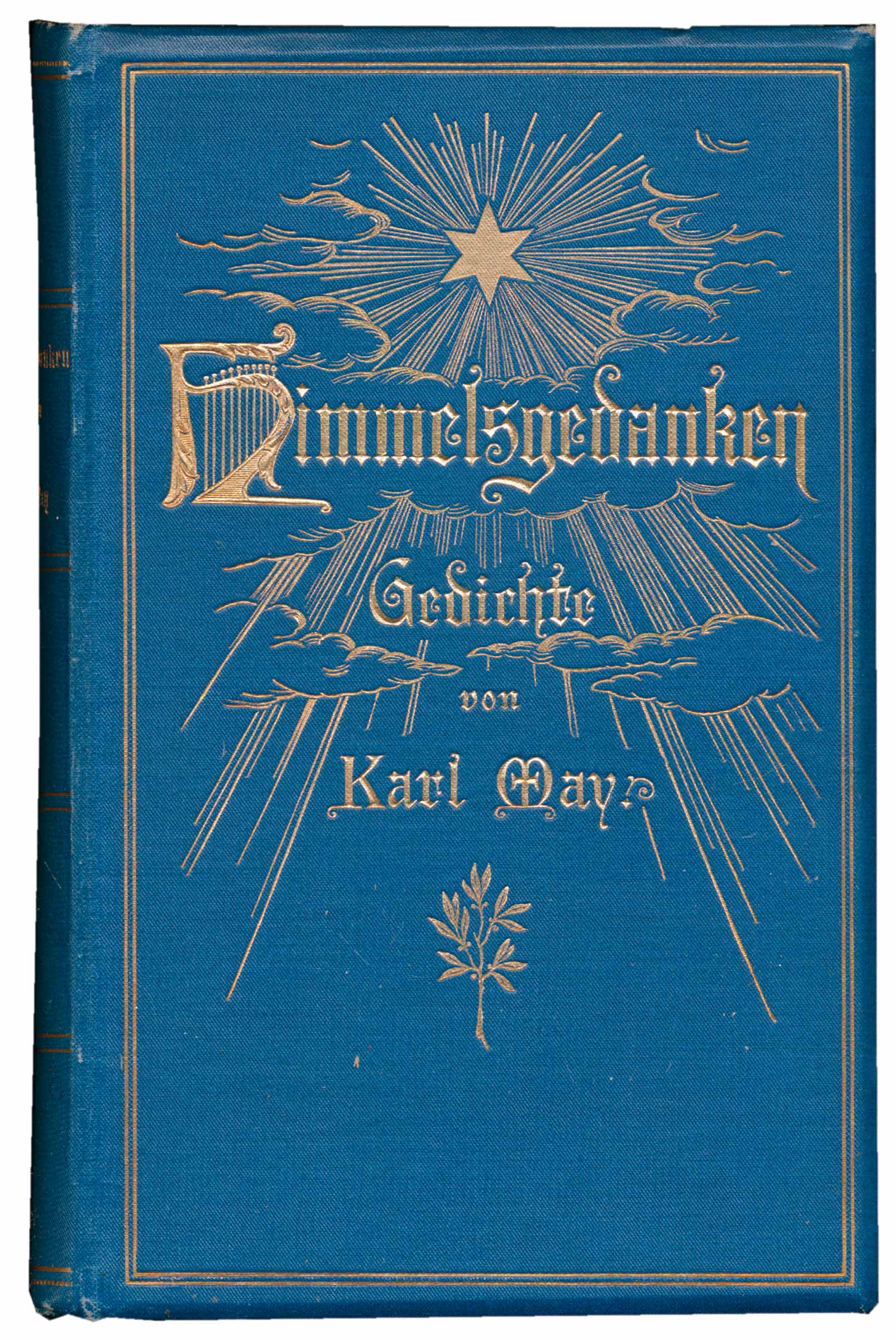 MAY, Karl: Himmelsgedanken. Gedichte. Freiburg (Fehsenfeld), (1900). XI, 360, 4 S. mit den goldenen Vorsatzpapieren und dreiseitigem Goldschnitt. reich verzierter blauer OLn mit Goldprägung. DB 91. NaV, sehr feines Ex. EA Plaul 330.