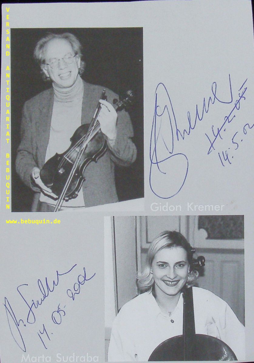 SUDRABA, Marta (Cellistin) + KREMER, Gidon (Violinist): eigenhändig von beiden signierte Portraitseite. München, 14.5.2002. 19 x 13,5 cm. 2 Bl. Seit 2010 lebt Marta Sudraba-Gürtler in Wien und ist als freischaffende Musikerin tätig, spielt regelmäßig im Orchester der Wiener Staatsoper und den Wiener Philharmonikern, der Camerata Academica und dem Symphonieorchester Vorarlberg. Geboren: 27. März 1975 in Riga, Lettland. Gidon Kremer (* 27. Februar 1947 in Riga, Lettische SSR, UdSSR) ist ein ehemals sowjetischer, heute lettisch-deutscher Violinist.(Wikipedia)