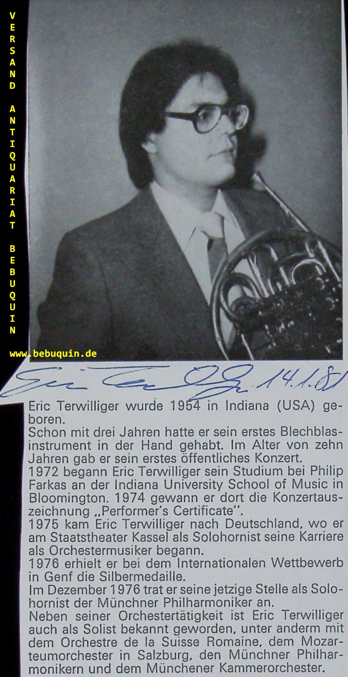 TERWILLIGER, Eric (Hornist): eigenhändig signierte und datierte Programmseite. München (Kongresssaal), 14.1.1981. 18 x 8,5 cm 1 Bl. Eric Terwilliger spielt leidenschaftlich gern Kammermusik und war Mitglied der Münchner Philharmonischen Solisten von 1977 bis 1992. Er ist seit 1991 Mitglied des Wiener Kammerensembles.