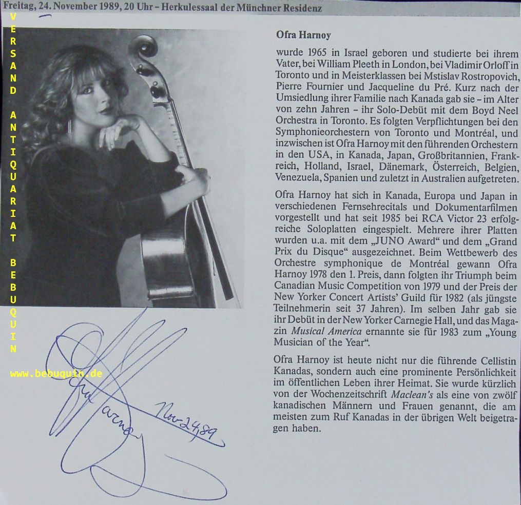 HARNOY, Ofra (Cellistin): eigenhändig signierte und datierte Portraitseite. München (Philharmonie), 24.11.1989. 16,5 x 17 cm. 1 Bl. dabei eine Portraitpostkarte. Ofra Harnoy CM (born January 31, 1965) is an Israeli-Canadian cellist. She is a Member of the Order of Canada. By joining the international artists roster of RCA Victor Red Seal, Ms. Harnoy became the first Canadian classical instrumental soloist since Glenn Gould to gain an exclusive worldwide contract with a major record label. She is a five-time Juno Award Winner. (Wikipedia)