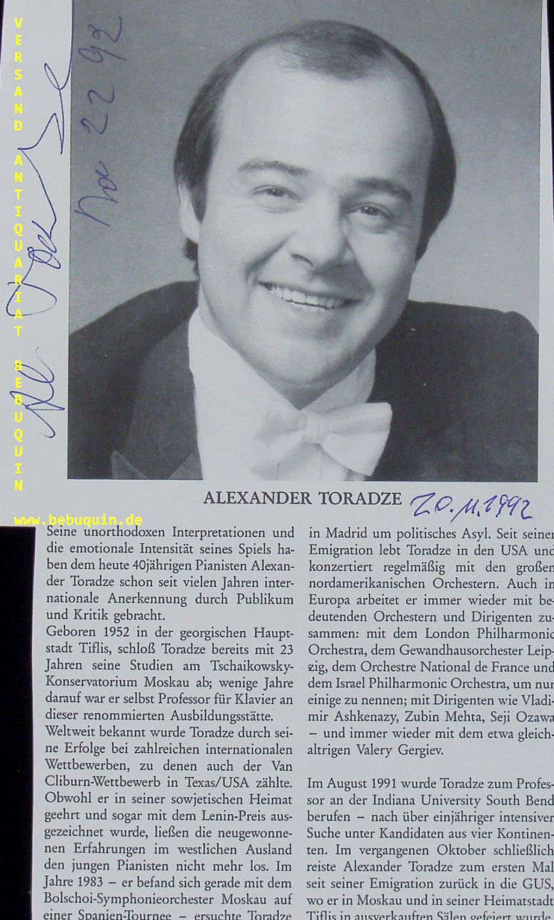 TORADZE, Alexander (Pianist): eigenhändig signierte und datierte Portraitseite. München (Philharmonie), 20.11.1992. 23 x 14 cm. 1 Bl. Aleksandre Toradse (* 30. Mai 1952 in Tiflis) ist ein georgischer Pianist. Toradse spielte mit allen größeren US-amerikanischen Orchestern und ist bekannt dafür, dass er vor dem Auftritt betet. (Wikipedia)