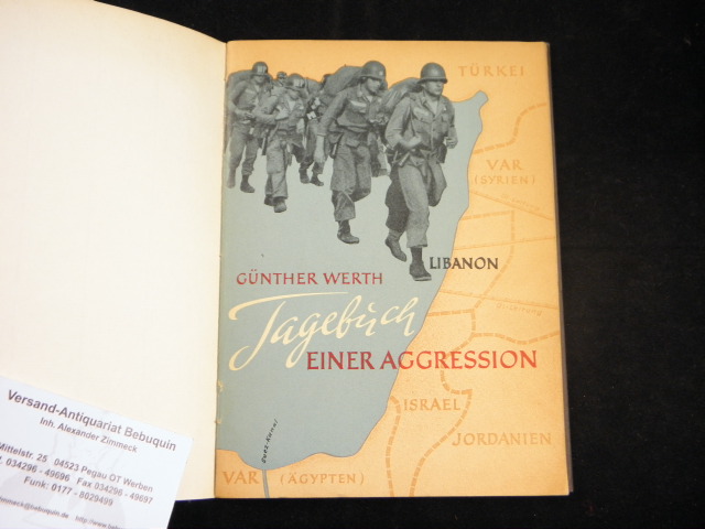 ORIENT.– WERTH, Günter: Tagebuch einer Aggression. Chromologische Darstellung der durch die amerikanisch-britische Aggression im Libanon und in Jordanien hervorgerufenenn Nahostkrise. Berlin (Ministerium Nationale Verteidigung), 1958. 78 S. mit Abb. HLn der Zeit mit eingebundenem ill. OKart. Ordnungsgemäß aus Bundeswehrbeständen ausgesondertes Bibliotheksexemplar (Stempel, Rückenschild). seltene EA.