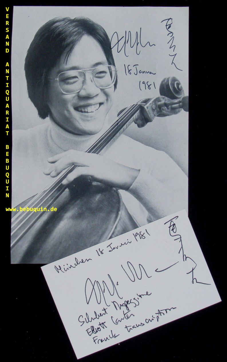 YO YO MA (Cellist): eigenhändig zweisprachig signierte und datierte Portraitseite (sehr schön) + eigenhändig zweisprachig signierte und datierte Autogrammkarte.. München (Herkulessaal), 18.1.1981. 8 x 12,5 + 21 x 14,5 cm. 2 Bl. Yo-Yo Ma (* 7. Oktober 1955 in Paris) ist ein US-amerikanischer Cellist. Seine Diskografie umfasst mehr als 100 Alben, die ihm 19 Grammys einbrachten (Stand 2020). (Wikipedia)