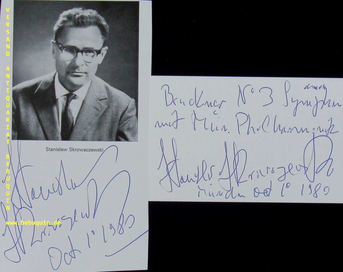 SKROWACZEWSKJI, Stanislaw (Dirigent): eigenhändig signierte und datierte Autogrammkarte + eigenhändig signiertes und datiertes Portraitfoto. München (Herkulessaal), 1.10.1980. 8 x 12,5 + 17 x 10 cm. 2 Bl. Stanislaw Pawel Stefan Jan Sebastian Skrowaczewski (* 3. Oktober 1923 in Lwów; † 21. Februar 2017 in St. Louis Park, Minnesota) war ein polnischer Dirigent und Komponist. (Wikipedia)