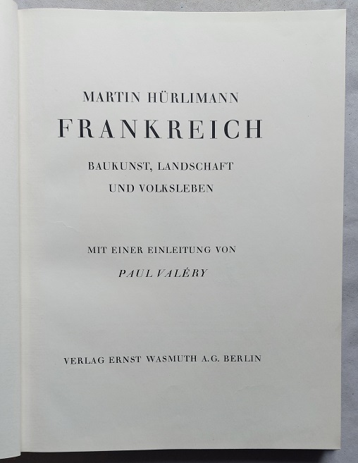 FRANKREICH.– HÜRLIMANN, Martin: Frankreich. Baukunst. Landschaft. Volksleben. Einleitung von Paul Valéry. Berlin (Wasmuth), 1927. 4°. 42 S. + 304 Bildtafeln. OLn mit goldgeprägter Deckelvignette. Ordnungsgemäß aus Bundeswehrbeständen ausgesondertes Bibliotheksexemplar (Rückenschild, Stempel), leicht bestaubt. dt. EA des 21seitigen Vorworts in der Übertragung durch Carl Einstein. nicht in WG².