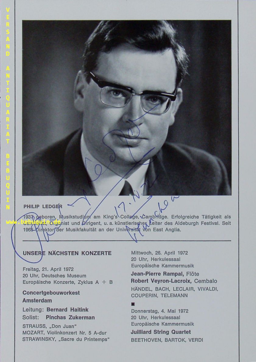 LEDGER, Philip (Dirigent): eigenhändig signierte und datierte Portraitseite. München (Herkulessaal), 17.4.1972. 21 x 15 cm. 1 Bl. Philip Ledger wurde 1937 geboren, war erfolgreich als Cembalist, Organist und Dirigent.
