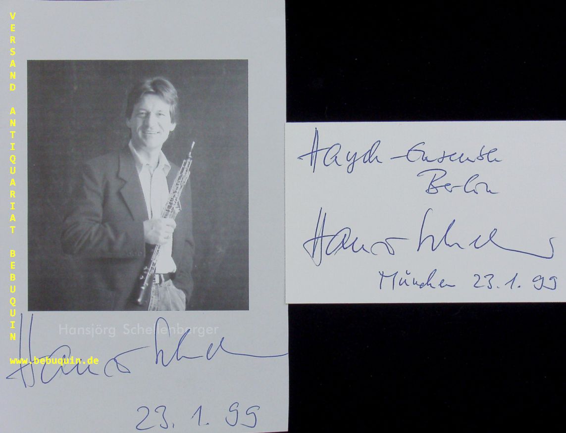 SCHELLENMBERGER, Hansjörg (Oboist): eigenhändig signierte und datierte Portraitseite + eigenhändig signierte und datierte Autogrammkarte. München (Philharmonie), 23.1.1999. 19,5 x 13 + 8 x 12,5 cm. 2 Bl. Hansjörg Schellenberger (* 13. Februar 1948 in München) ist ein deutscher Oboist und Dirigent. (Wikipedia)