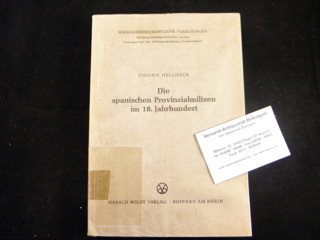 SPANIEN.– HELLWEGE, Johann: Die spanischen Provinzialmilizen im 18. Jahrhundert. Boppard (Boldt), 1969. Gr. 8°. 471 S. fol. OKart. Ordnungsgemäß aus Bundeswehrbeständen ausgesondertes Bibliotheksexemplar (Rückenschild, Stempel). = Wehrwissenschaftliche Forschungen, Bd. 9. EA.