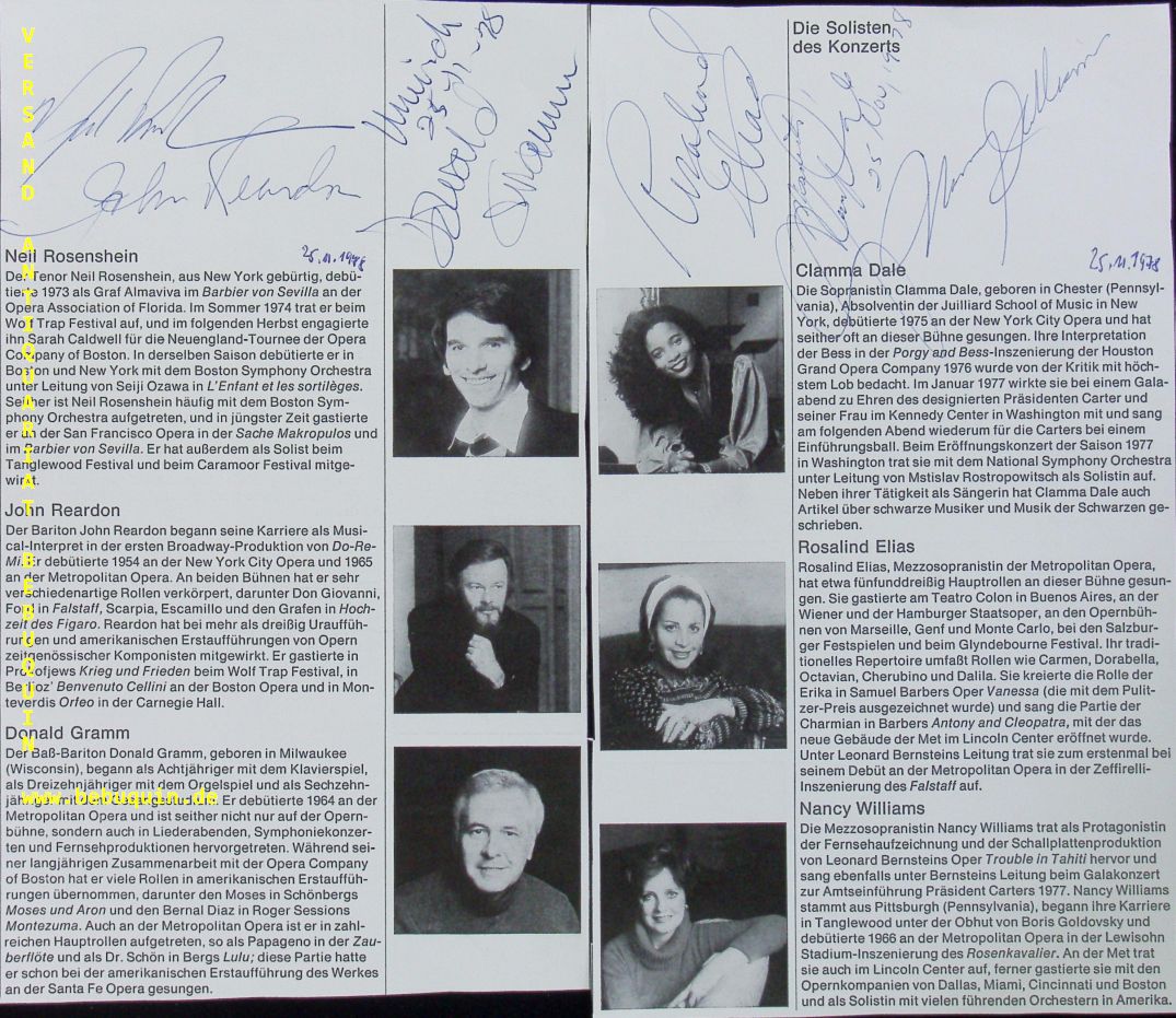 DALE, Clamma + ELIAS, Rosalind + WILIAMS, Nancy + ROSENSHEIN, Neil + REARDON, John + GRAMM, Donald (6 Sänger): eigenhändig von allen signierte und datierte Portraitseiten. München, 25.11.1978. 24 x 14 cm. 2 Bl. Clamma Churita Dale (born 1948) is an American operatic soprano. She portrayed „Bess“ in the highly successful 1976 Houston Grand Opera production of Porgy and Bess. Rosalind Elias (March 13, 1930 – May 3, 2020) was an American mezzo-soprano who enjoyed a long and distinguished career at the Metropolitan Opera. She was best known for creating the role of Erika in Samuel Barber’s Vanessa in 1958. Neil Rosenshein (born November 27, 1947 in New York City) is an American operatic tenor, who sang leading tenor roles in the major American and European opera houses. He created the roles of Aspern in Dominick Argento’s The Aspern Papers and Léon in Corigliano’s The Ghosts of Versailles. John Reardon (April 8, 1930 – April 16, 1988) was an American baritone and actor who was noted for his performances on television, including many appearances on the PBS children’s television show Mister Rogers’ Neighborhood. Donald John Gramm (February 26, 1927 – June 2, 1983) was an American bass-baritone whose career was divided between opera and concert performances. (Wikipedia)