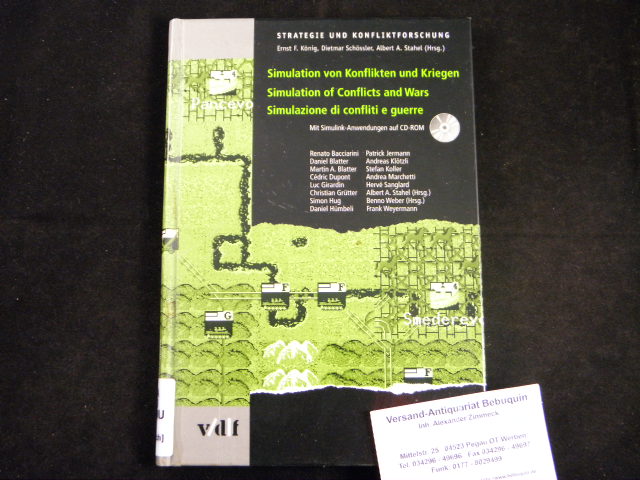 KÖNIG / SCHÖSSLER / STAHEL: Strategie und Konfliktforschung. Simulation von Konflikten und Kriegen. Anwendungen mit Simulink. Deutsch / Englisch. Zürich (vdf); 2002. Gr. 8°. 112 S. mit CD inliegend. ill. OPb. Ordnungsgemäß aus Bundeswehrbeständen ausgesondertes Bibliotheksexemplar (Rückenschild, Stempel). EA.