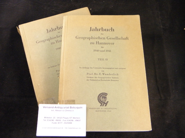 HANNOVER.– WUNDERLICH, E.: (Hrsg.) Hannover. Bild, Entwicklungsgang und Bedeutung der niedersächsischen Hauptstadt. Zum 700jährigen Jubiläum der Stadt Hannover. 2 Teile in 2 Bänden. Hannover (Hahnsche), 1942. VI, 555 S. mit diversen Textabbildungen + 123 teils gefaltete Tafeln. OKart. Ordnungsgemäß aus Bundeswehrbeständen ausgesondertes Bibliotheksexemplar (Rückenschild, Stempel). = Jahrbuch der Geographischen Gesellschaft zu Hannover für 1940 und 1941.