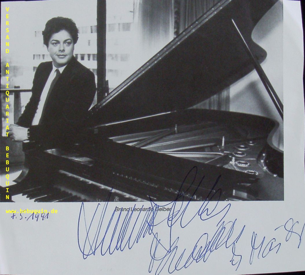 GELBER, Bruno Leonardo (Pianist): eigenhändig signierte und datierte Pottraitseite. München (Herkulessaal), 7.5.1991. 16 x 18 cm. 1 Bl. Bruno Leonardo Gelber (* 19. März 1941 in Buenos Aires) ist ein argentinischer Pianist. (Wikipedia)