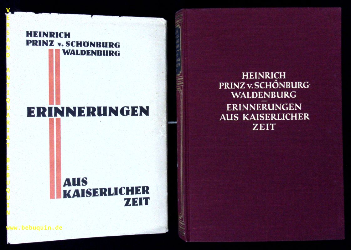 SCHÖNBURG-WALDENBURG, Heinrich von: Erinnerungen aus kaiserlicher Zeit. Leipzig (Koehler), 1929. 312 S. mit 23 Bildtafeln. OLn mit OUmschl. kaum bestaubt. EA